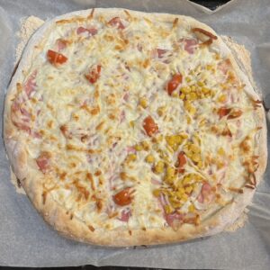 - Lisztezett felületen kinyújtjuk a pizzatésztát 1 cm vastagra.